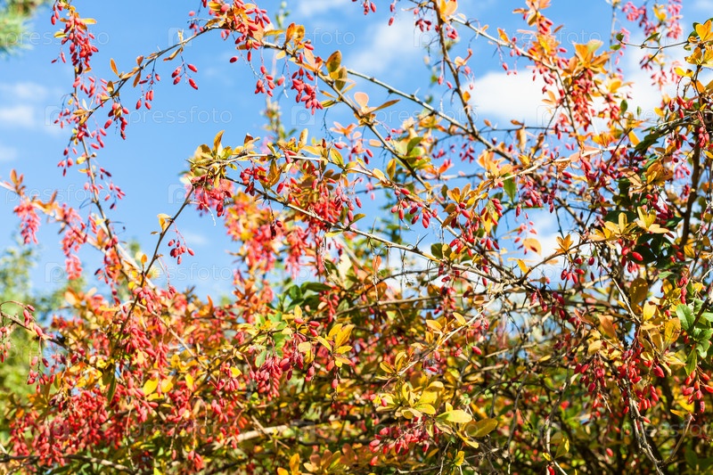 Красочный кустарник барбариса со спелыми плодами осенью