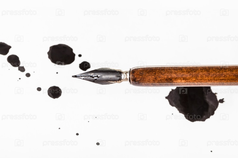 Коричневое перо и черные чернильные пятна на белой бумаге