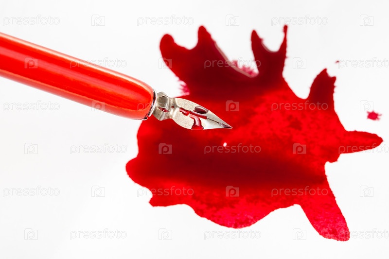 Выше вид пера в красной ручке над пятном красных чернил