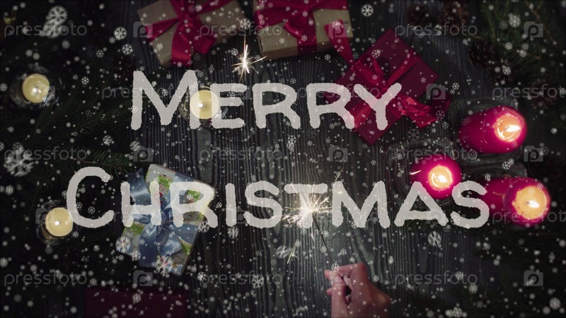 Поздравительная открытка с Рождеством, белые буквы, красные свечи, подарки
