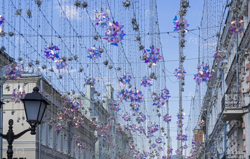 Уличная иллюминация на фоне голубого неба. Улица Кузнецкий Мост, Москва, Россия
