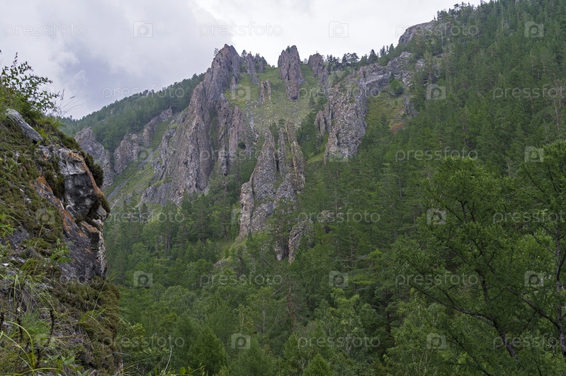 Горный склон, поросший тайгой. Иркутская область, прибайкалье, Россия. Август