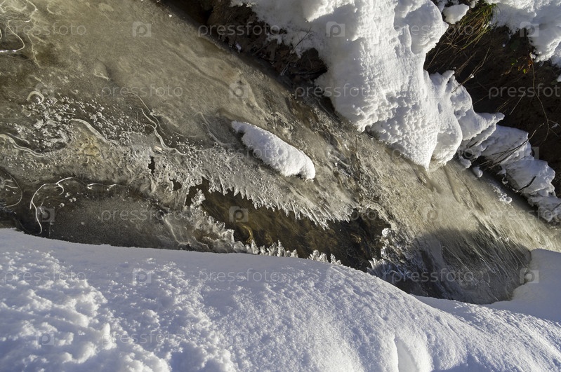 Кристаллы льда над незамерзающим участком лесного ручья. Солнечный день в феврале