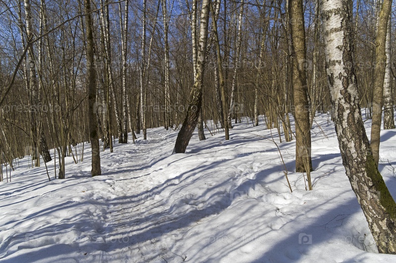 Весенний лес. Тропинка, идущая по краю небольшого оврага. Солнечный день в марте
