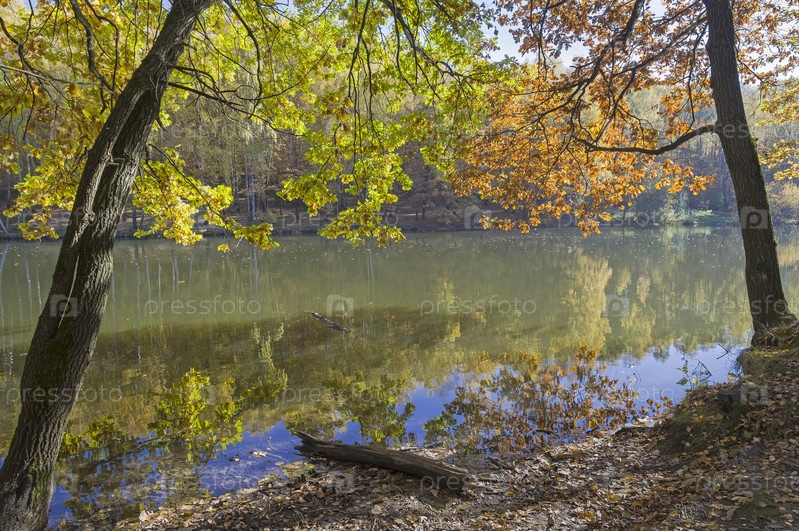 Ветки дуба с яркими желтыми листьями свисают над прудом и отражаются в воде. Теплостановский лесопарк, Москва. Солнечный день в октябре