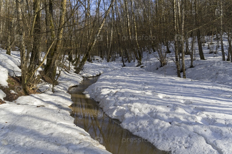 Ручей в весеннем лесу. Солнечный день в апреле