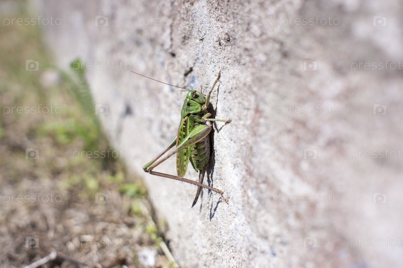 Кузнечик на белой стене с копией пространства