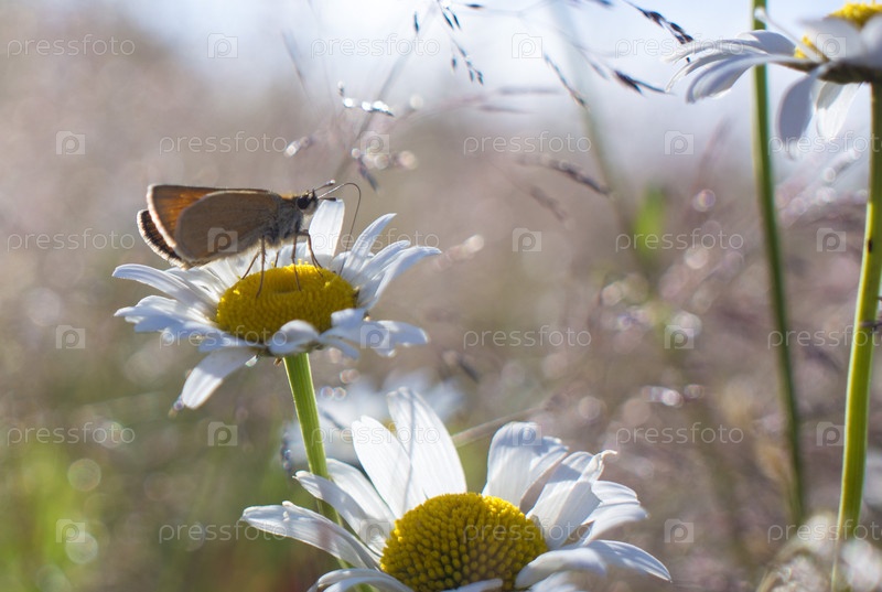 Яркие оранжевые бабочки на цветках маргаритки