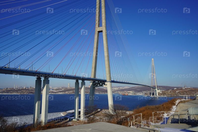 Пейзаж с видом на Русский мост на фоне голубого неба. Владивосток, Россия