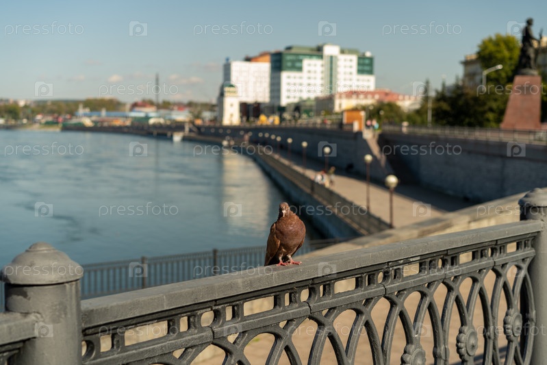 Портрет голубя на фоне набережной и реки