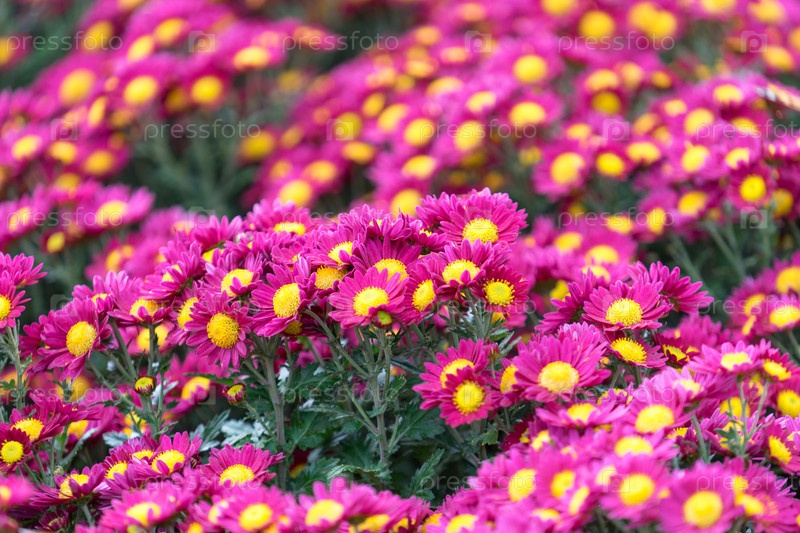 Цветочный фон с ярко-розовой хризантемой с желтым ядром на размытом фоне