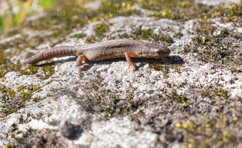 Красивая коричневая ящерица греется на солнце. Лежит на сером камне