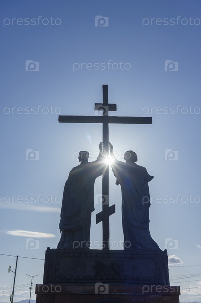 Петропавловск-Камчатский, Россия-8 октября 2019 г.: Памятник святым апостолам Петру и Павлу на фоне неба
