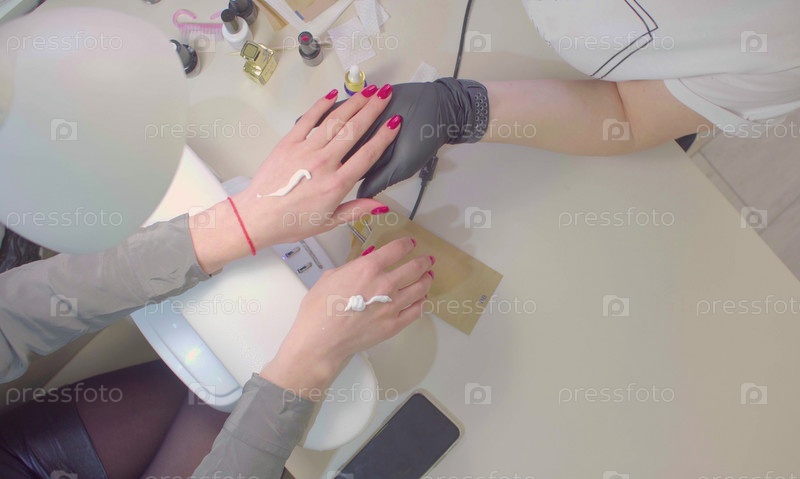 Маникюрша наносит крем на руки