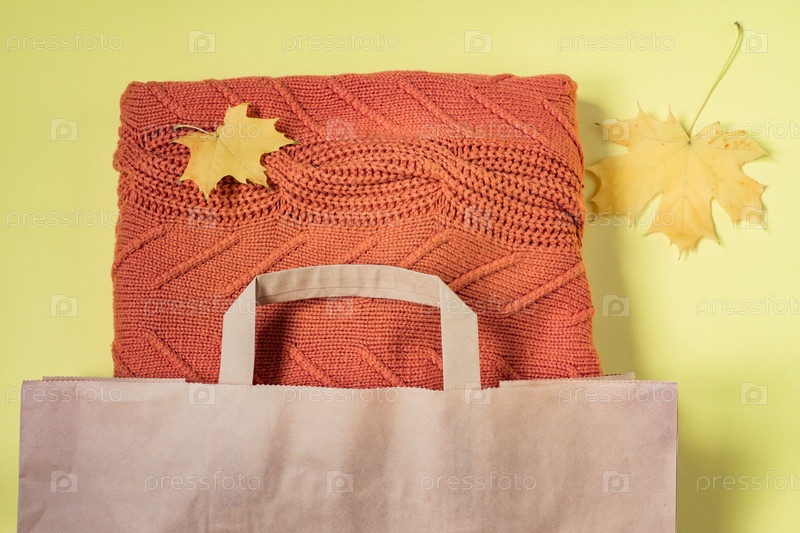 Оранжевый женский теплый свитер в бумажной упаковке на желтом фоне с украшением из осенних кленовых листьев. Продажа одежды и концепция черной пятницы. Вид сверху