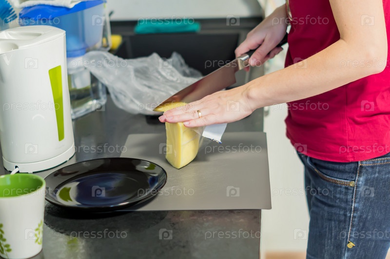 Женщина в красной футболке и джинсах готовит завтрак. Резка сыра на пластиковой доске на современной черно-белой кухне