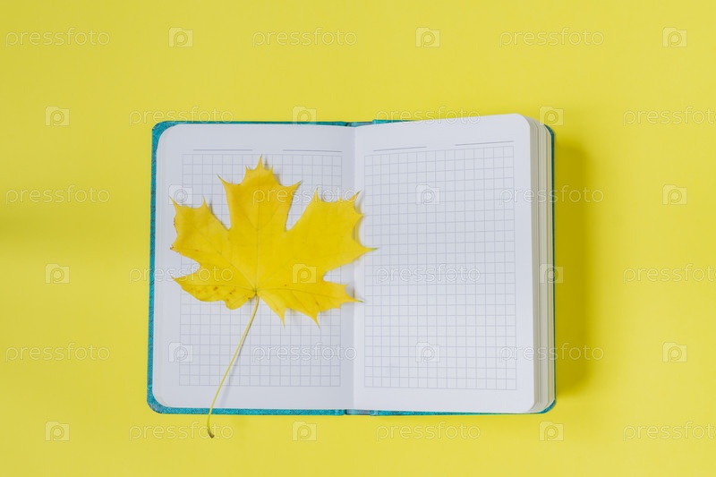 Пустой открытый блокнот с кленовым листом на желтом фоне. Пустой дневник и осенняя концепция