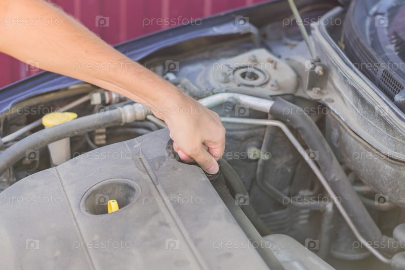 Механик проверяет и чинит крышку маслозаливной горловины сломанной машины на дороге