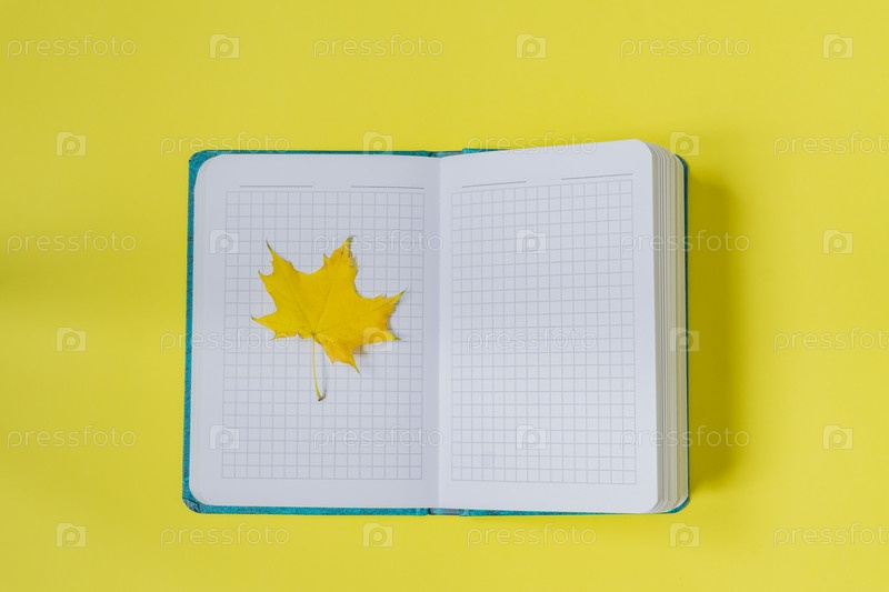 Пустой открытый блокнот с кленовым листом на желтом фоне. Пустой дневник и осенняя концепция