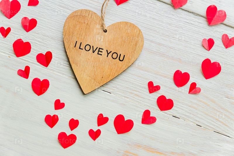 Большое красное сердце из вырезанных бумажных маленьких сердечек и деревянное сердце с надписью "Я люблю тебя" на деревянном фоне. Украшение своими руками на день святого Валентина