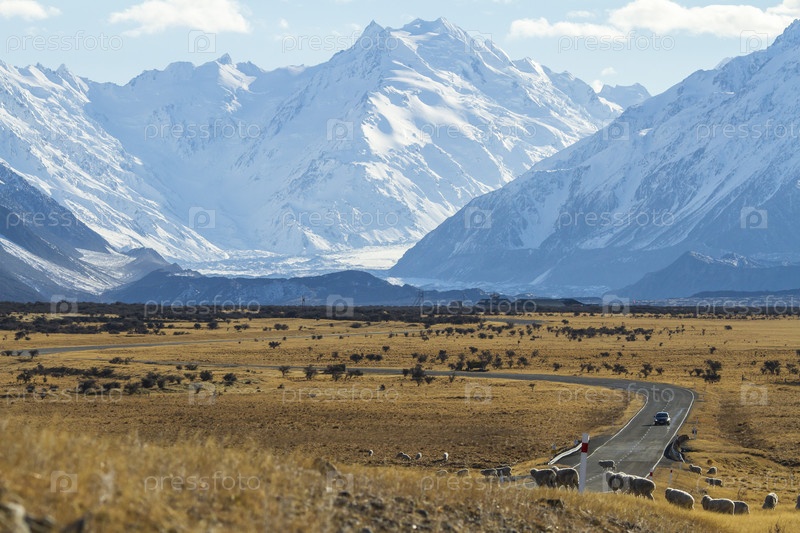 Шоссе в Новой Зеландии. Ягнята возле дороги