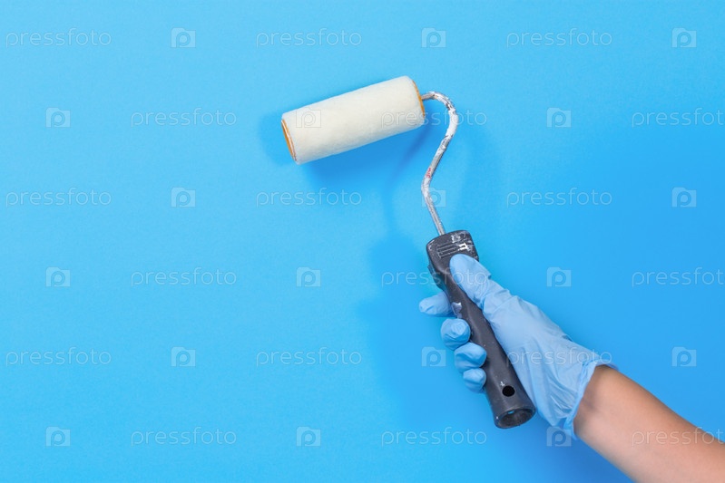 Рука с валиком для покраски стен, синий фон, место для текста. ремонт дома