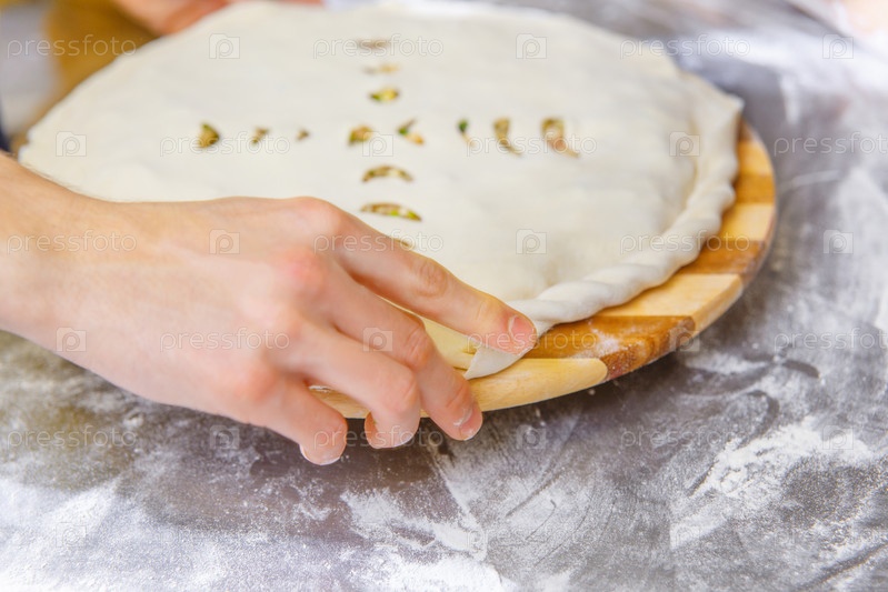 Руки закрывают осетинский пирог с начинкой из фарша на металлическом столе кухни ресторана