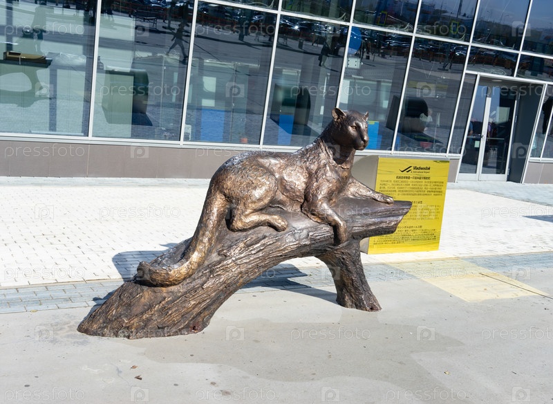 Владивосток, Россия-9 октября 2019 г.: Скульптура животного у здания аэропорта