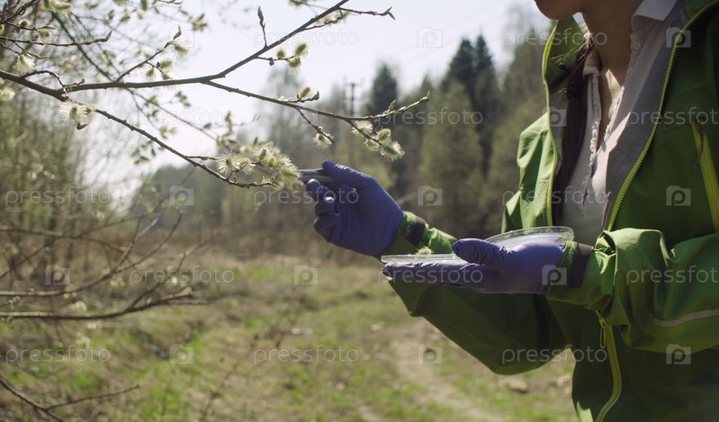 Эколог получает образцы цветков ивы