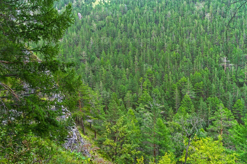Горный склон, поросший тайгой. Иркутская область, прибайкалье, Россия. Август