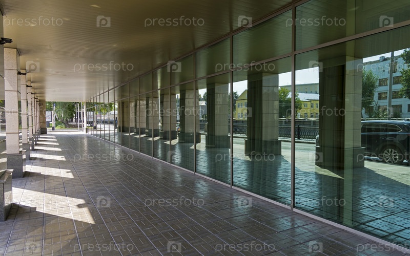 Длинный проход с колоннами. Офисное здание на Овчинниковской набережной, Замоскворечье, Москва