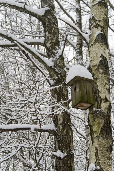 Заснеженный скворечник в зимнем лесопарке
