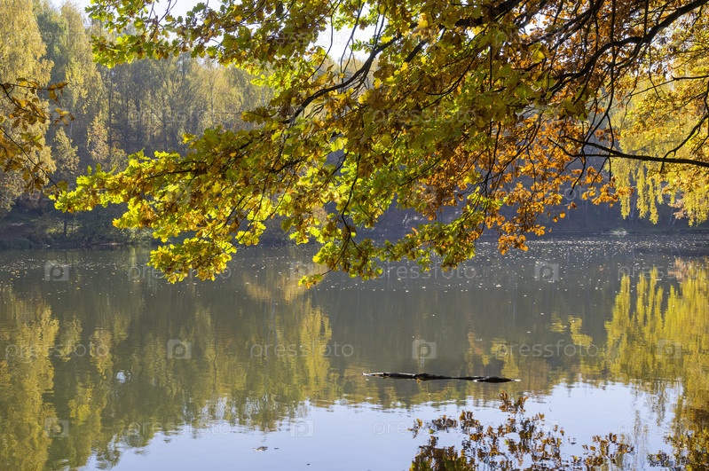Ветки дуба с яркими желтыми листьями свисают над прудом. Теплостановский лесопарк, Москва. Солнечный день в октябре