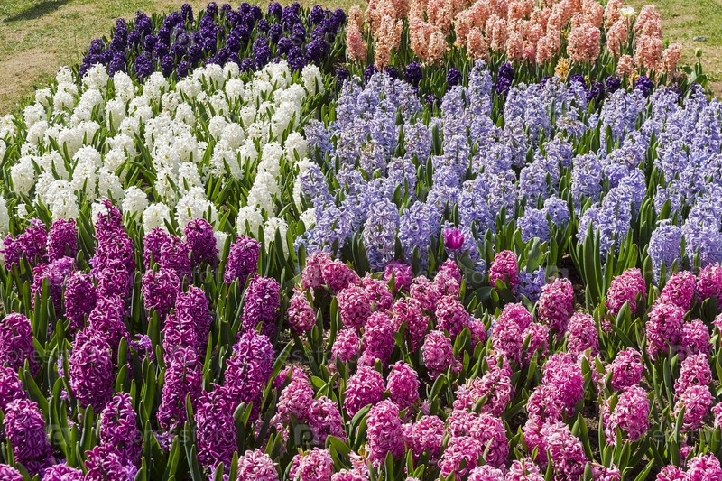 Красивые разноцветные гиацинты под ярким весенним солнцем в Аптекарском Огороде (филиал ботанического сада МГУ). Москва