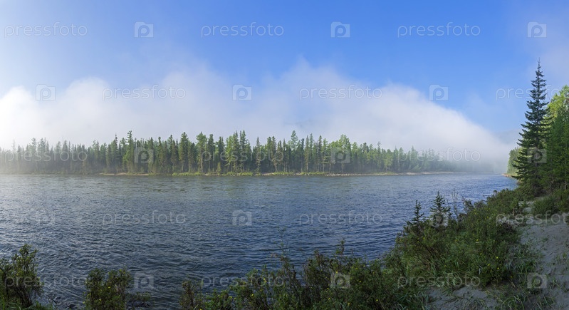 Панорама берега горной реки.Горы скрыты поднимающимся утренним туманом. Река Ока Саянская, ущелье Орхо-Бом, Восточный Саян, Бурятия, Сибирь, Россия