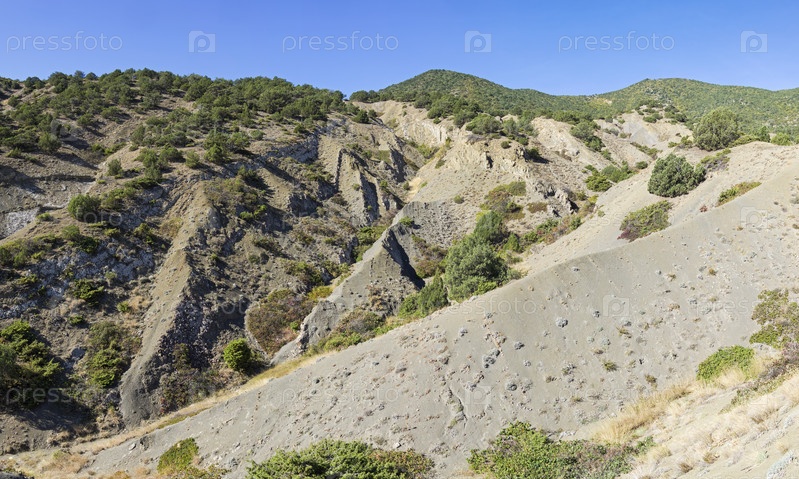 Глиняные овраги у подножья гор. Видна структура осадочных пород. Крым, солнечный день в сентябре