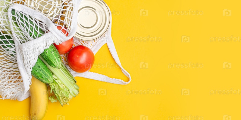 Доставка еды. Продукты питания в авоське на желтом фоне. консервы, помидоры, огурцы, бананы