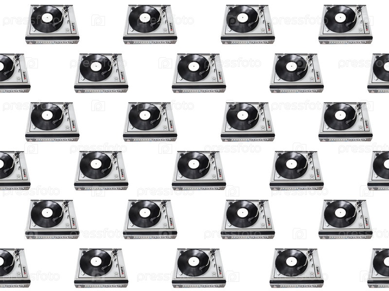 Бесшовный узор. Абстрактная часть проигрывателя изолирована на белом фоне. Диск-жокей проигрыватель и винил. Концепция ретро-музыки