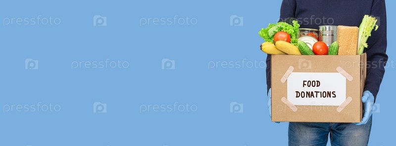 Мужчина держит картонные коробки в медицинских резиновых перчатках. Коронавирус волонтер