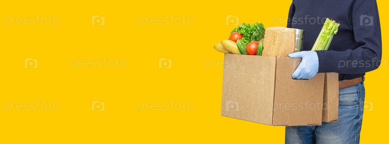 Доставщик держит картонные коробки в медицинских резиновых перчатках
