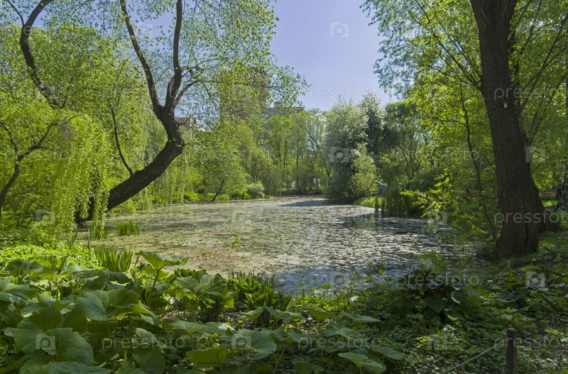 Старый заросший пруд в парке. Аптекарский Огород (филиал ботанического сада МГУ). Москва. Солнечный день в середине мая