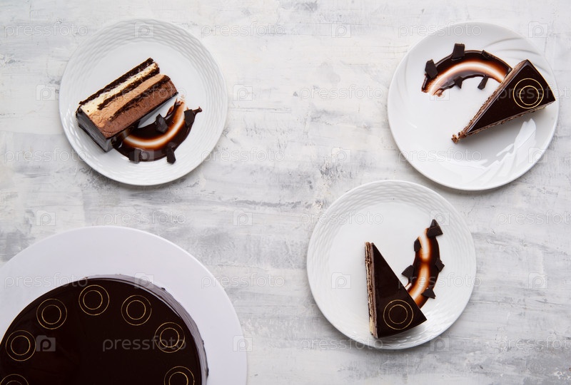 Вид сверху на кусочки шоколадного торта на белой тарелке