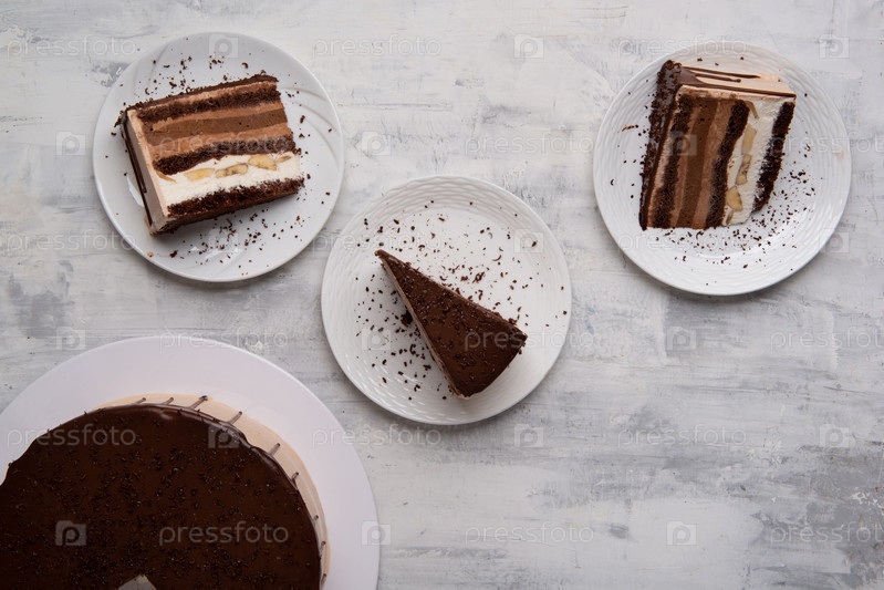 Вид сверху на кусочки шоколадного торта на белых тарелках