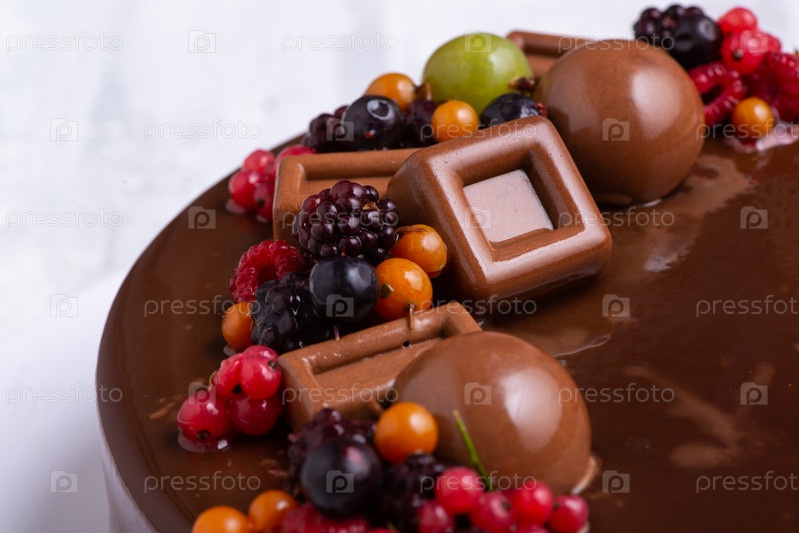 Крупный план торта с шоколадной глазурью, украшенного ягодами