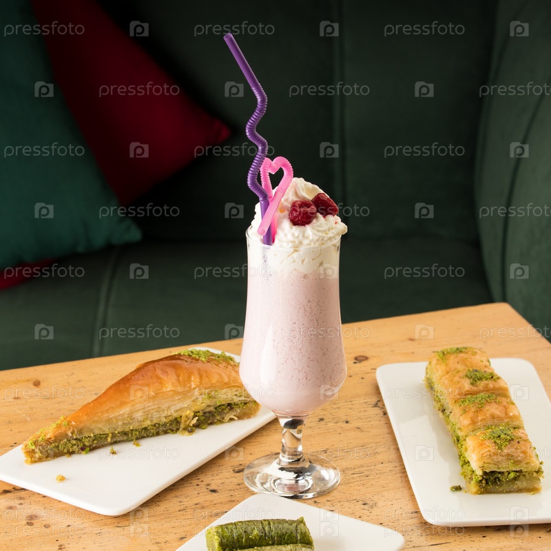 Полезный клубничный коктейль в кружке с трубочками для питья рядом с пахлавой на деревянном столе