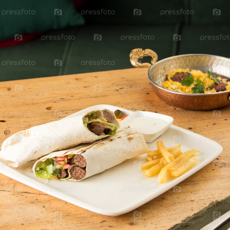Крупный план шашлыков с овощами, завернутыми в лепешку