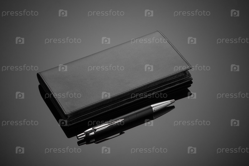Крупный план модного кожаного мужского кошелька и ручки на черном фоне