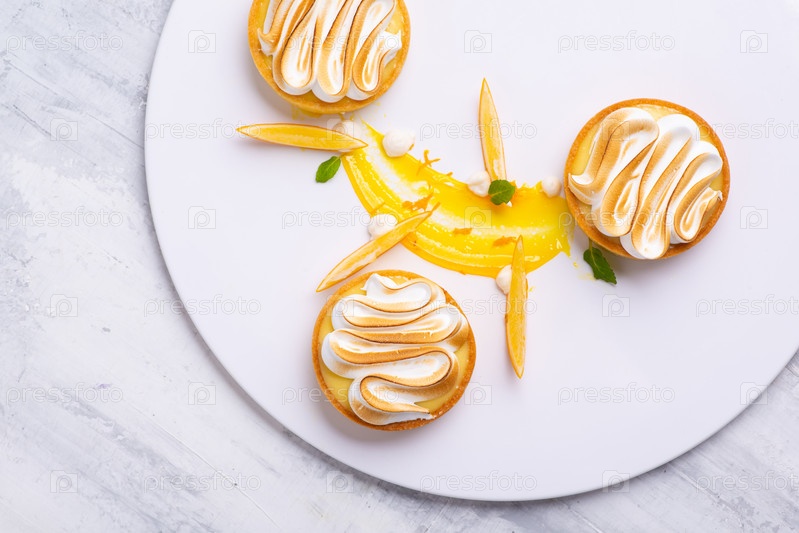 Аппетитные лимонные тарталетки с безе подаются на белой тарелке