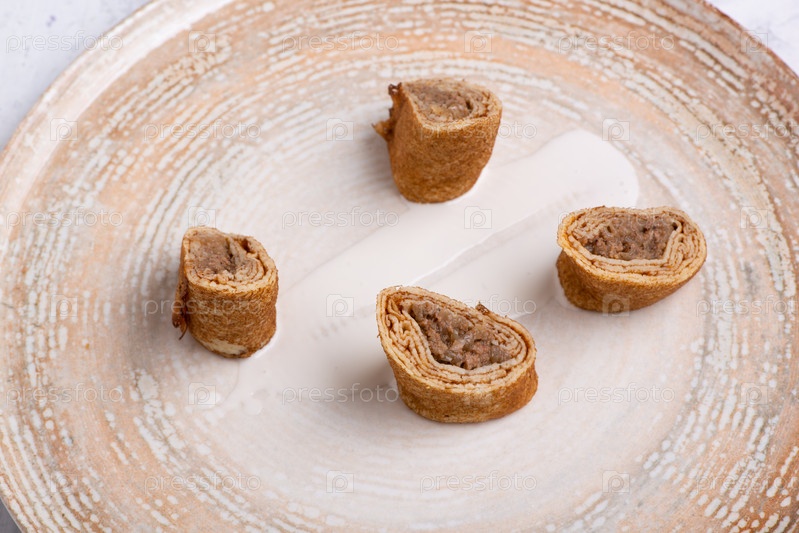 Тарелка фаршированных блинов с мясом на белом столе