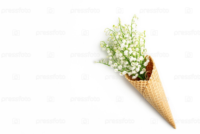 Букет ландышей в вафельном рожке на белом фоне. Копирование пространства, плоская планировка, вид сверху